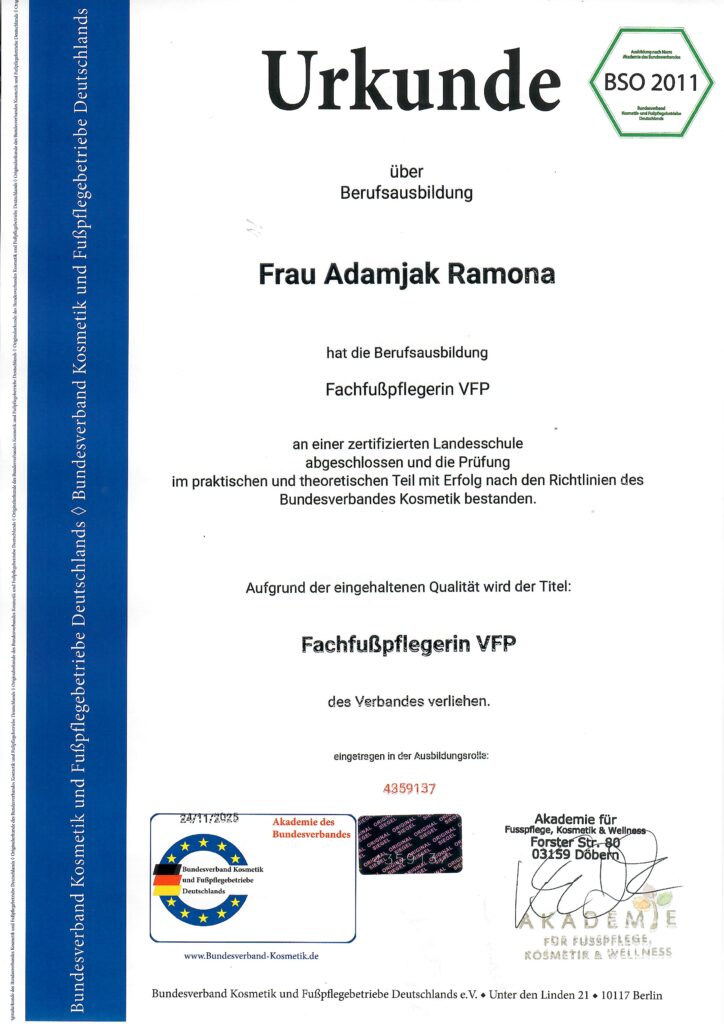 Als zertifizierte Fachfußpflegerinnen VFP (Bundesverband Kosmetik und Fußpflegebetriebe Deutschlands e.V.) arbeiten wir mit hochwertigen medizinischen Produkten und unter strengsten Hygienestandards – Desinfektion und Sterilisation sind für mich selbstverständlich.